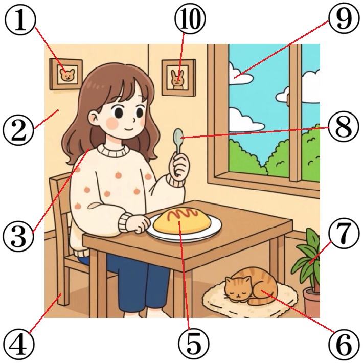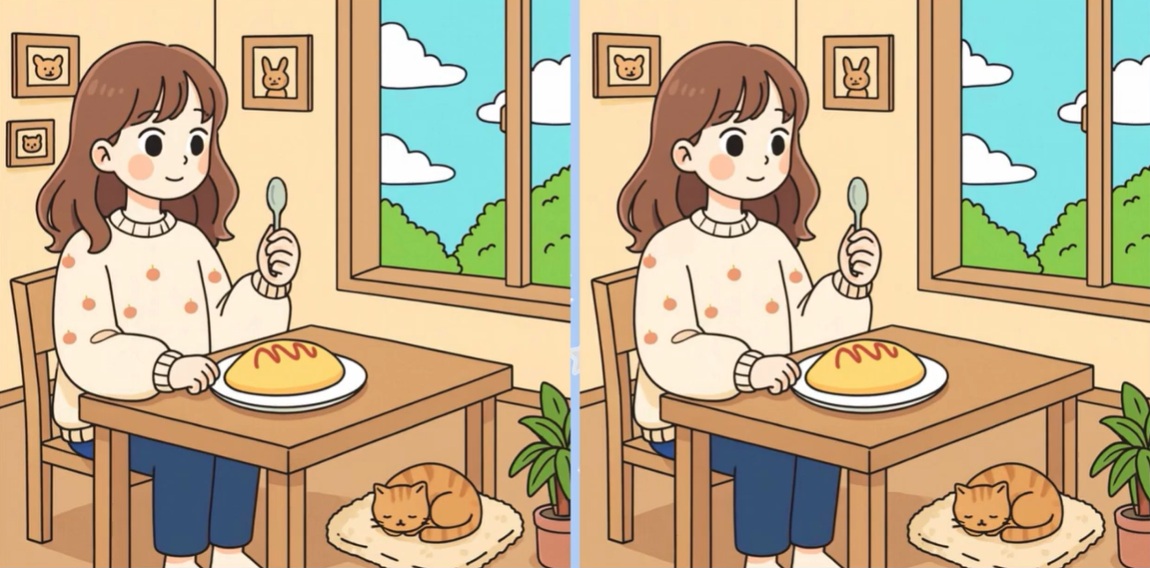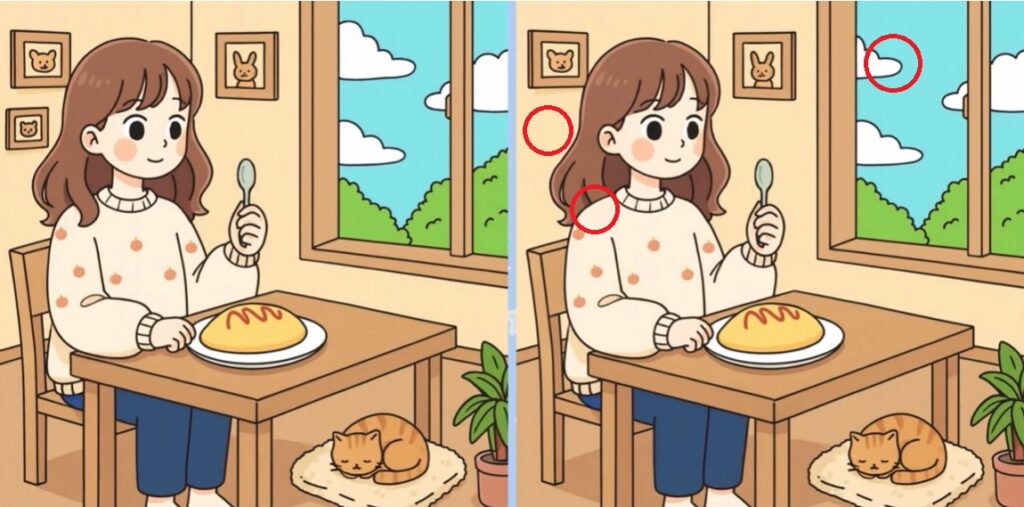 間違い探し 10 間違い探し 2026.04.07左右の二つの画像(60秒間)を見て、3つの間違いを当てるクイズです。あなたはいくつわかるかな? ※ 音量に注意して下さいQ. 間違い(3つ)を探したら、下に回答! 「問題」 画像を見る A. 3つの間違いの番号は?(下の番号をタップ) BGM停止12345678910 正 解 を 見 る 【正解】